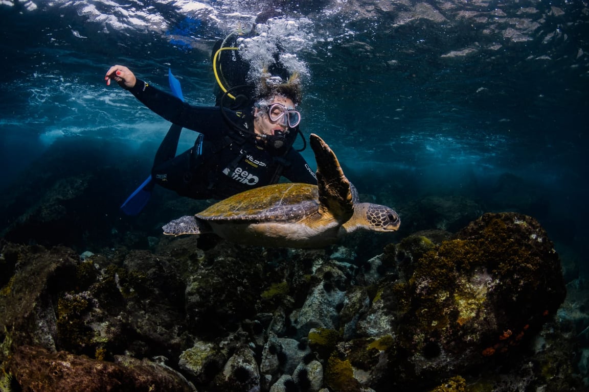 Utilizamos roupas de mergulho italianas de 5 mm de espessura, ideais para a temperatura da água de Arraial do Cabo (20 °C a 22 °C), garantindo conforto térmico durante toda a experiência.